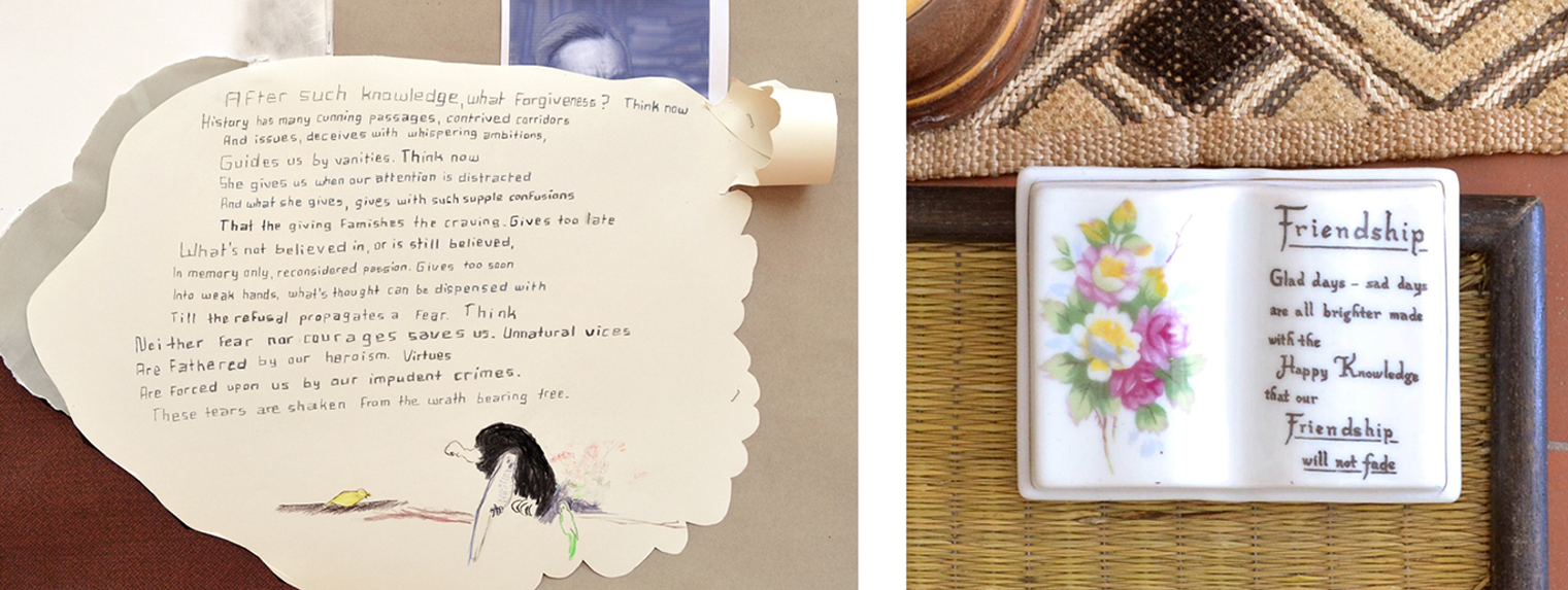 Bettina Carl: HAPPY KNOWLEDGE / TO THE OLD ACQUAINTANCIES details: drawings, fabric, collage, inkjet print, and found objects
