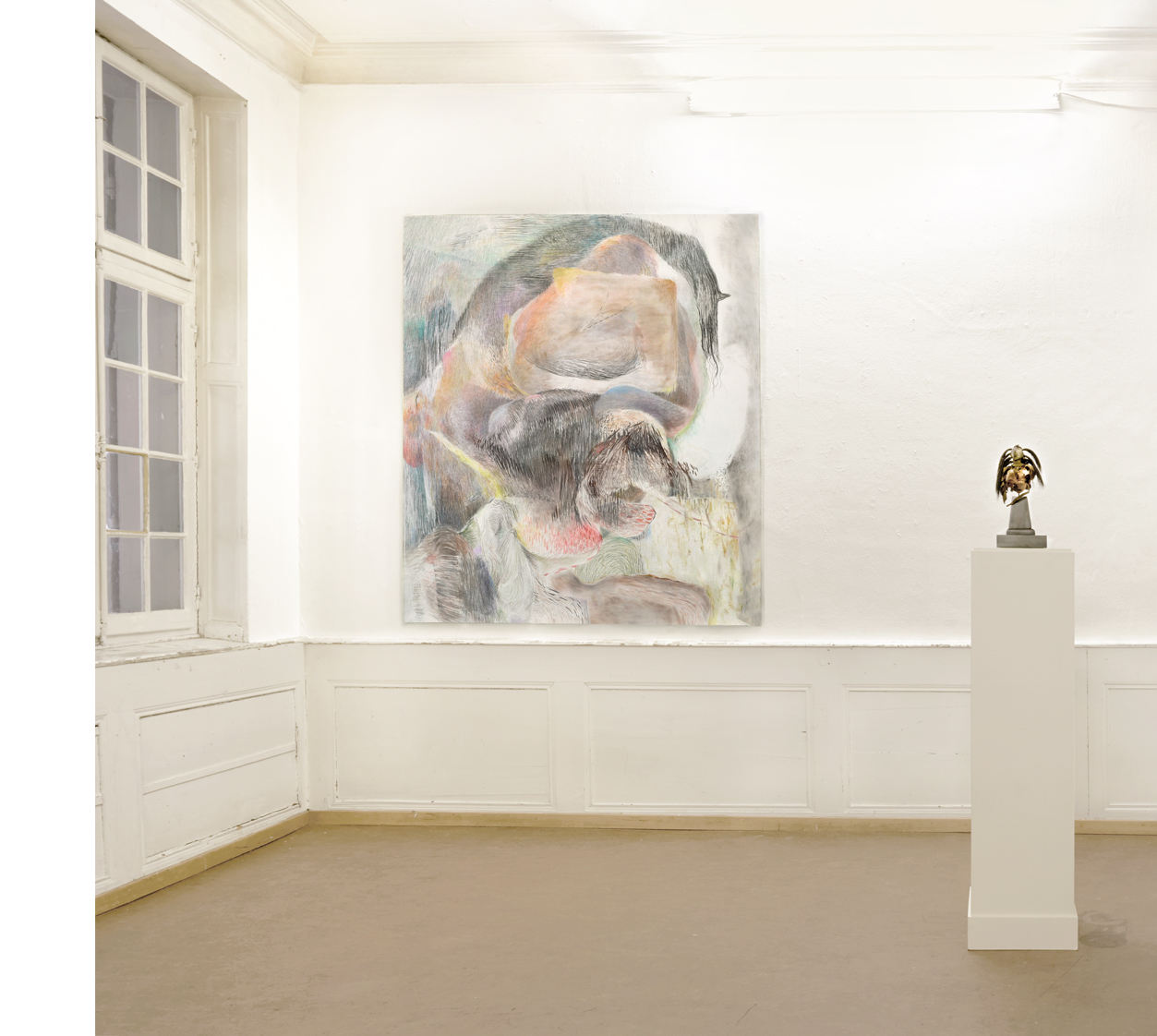 exhibition view: Raum LINKS, DuflonRacz gallery, Bern left: Bettina Carl KNOTEN KNOT, 2016 pastel chalk, charcoal on paper, 178 x 150 cm right: ritual object, Luba-Shankadi culture, Kongo (late 19th/early 20th century) |
