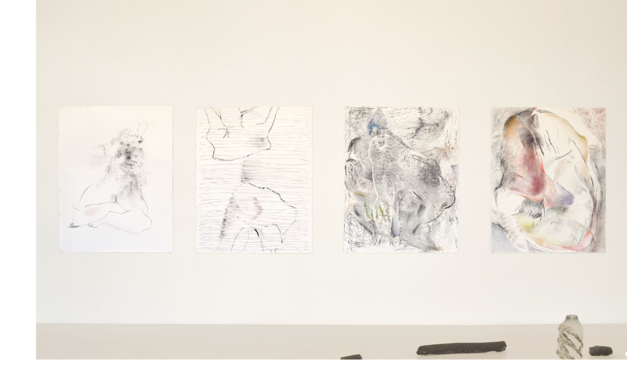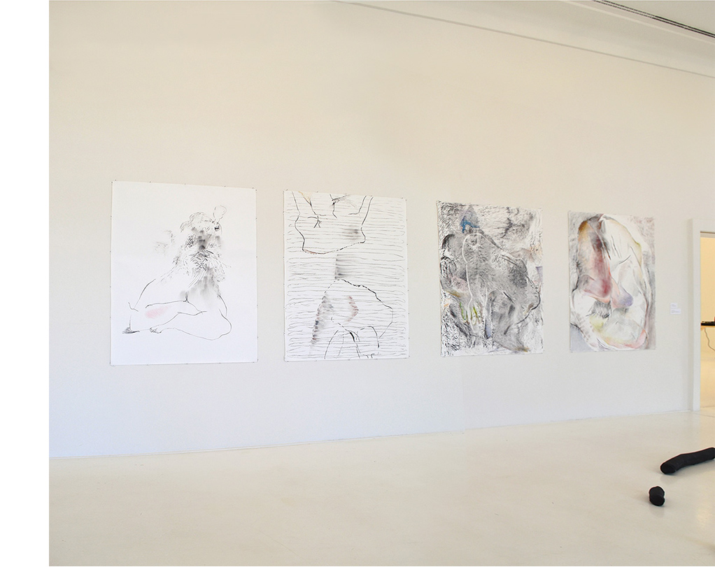Bettina Carl: FALTEN - ANTI-FALTEN 2016-2017 pastel chalk, charcoal on paper 150 x 122 cm each from left to right: OH, 2016 SCHWIMMER SWIMMER, 2016 BETRACHTER SPECTATOR, 2017 MISS, 2017 please scroll down |