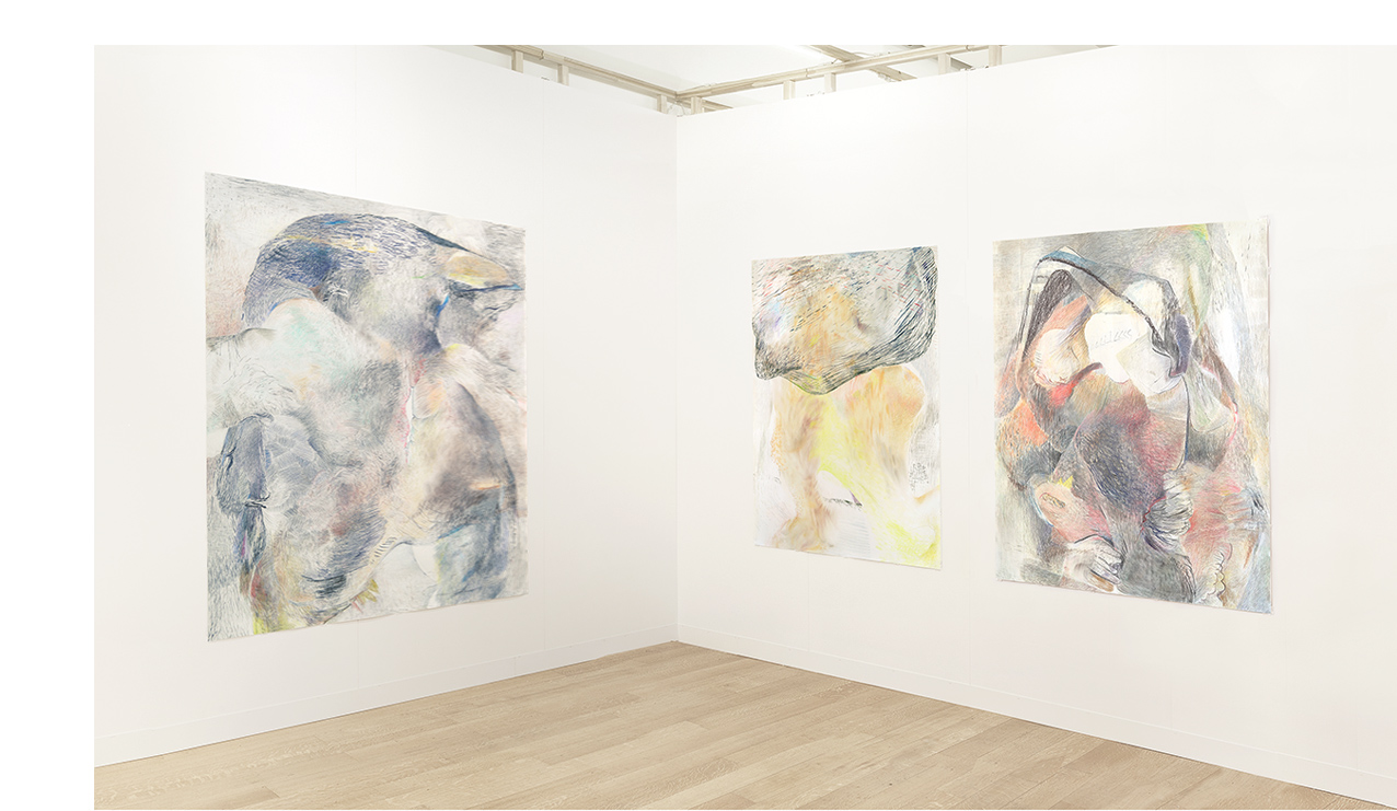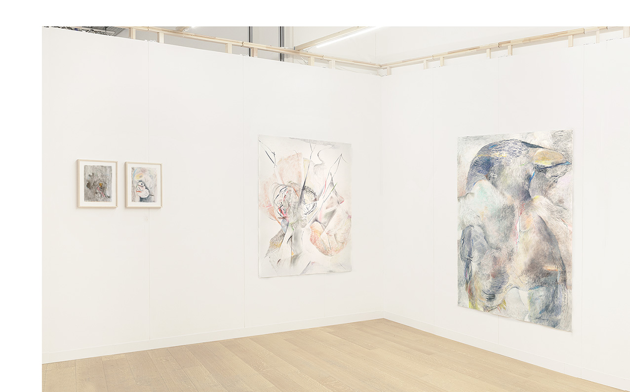 left: MEISENMANN, 2016-2017 pastel chalk, charcoal on paper, 178 x 150 cm right: OHNE TITEL WOLKE, 2017 and OHNE TITEL SELBDRITT, 2017 pastel chalk, charcoal on paper, 150 x 122 cm each |