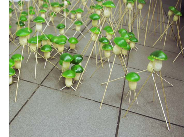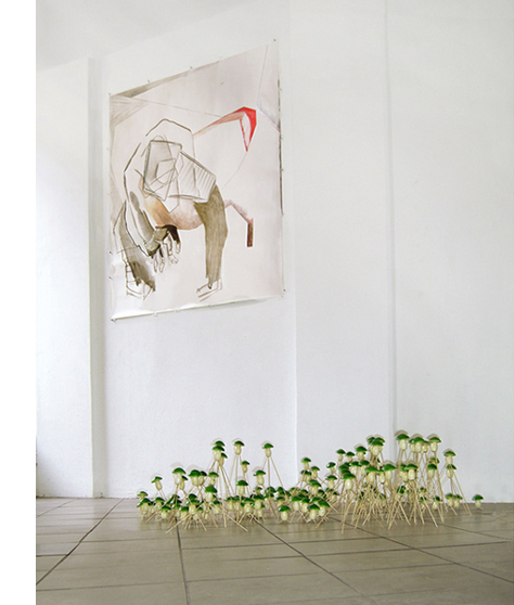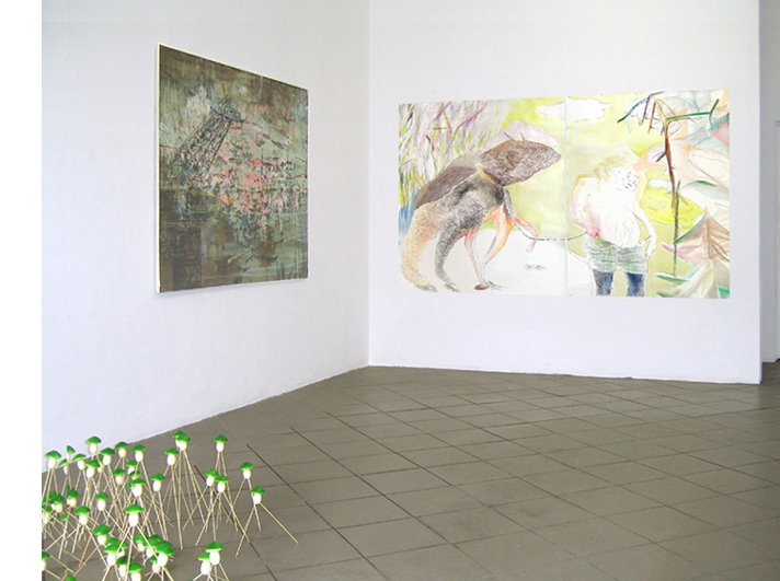 wall: BIEST BEAST, watercolour, pencil on paper, 150 x 140 cm, 2008 floor: UNTITLED plastic mushrooms, wood, ca. 40 x 180 x 200 cm, 2009 |