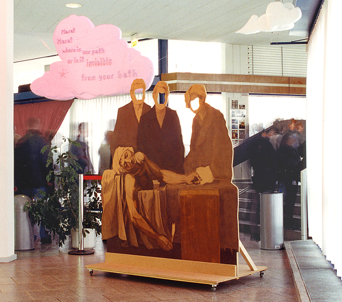 PATH. History maybe regarded as a collective formation of knowledge. Throughout this process, images of heroes and leaders serve as our links to history - regardless whether they look down on us from their pedestals, or whether they have been turned over and lie on the ground, smashed to pieces. David's "La Mort de Marat" is an odd example of a political hero depicted: The dead Marat strongly recalls the generic rendition of the entombment of Christ, and thus the ultimate image of martyrdom: a saviour devoid of any physical power. Moreover, David even decided to accentuate the rather humiliating circumstances of the revolutionary's death: The fervent jacobin was actually soaking in a medicinal bath when he received his killer, young Charlotte Corday. Unlike Jaques Louis David's painting, PATH. invites the viewer to enter the scene. One may pose as an eye-witness here, however this position won't offer any insights of the site of the crime. On the larger cloud above, in red light, a desperate call for guidance is to be read: Marat Marat where is our path or is it invisible from your bath. This plea is recurring in Peter Weiss' play; an answer, however, is not being offered. |
