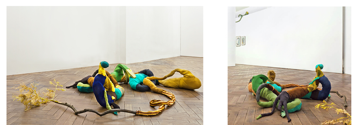 FORSTGOTTHEITEN: ABLEGER 1, 2011, Textilien, Holz, Schaumstoff, Acrylfarbe, Größe variabel, hier ca. 60 x 230 x 250 cm. Installationsansicht Schau Ort Galerie Christiane Büntgen Zürich, Oktober 2011