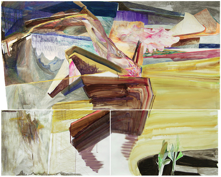 Aquarell, Bleistift, Buntstift, Kugelschreiber auf Papier, drei Teile, ca. 225 x 300 cm