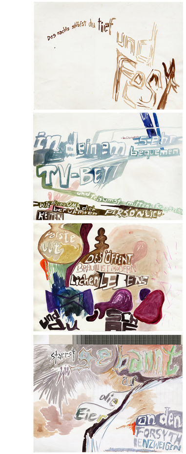 NACHTS AT NIGHT, 2002   watercolour, ballpoint pen, pencil, collage on paper, four parts, all ca. 105 x 33 cm